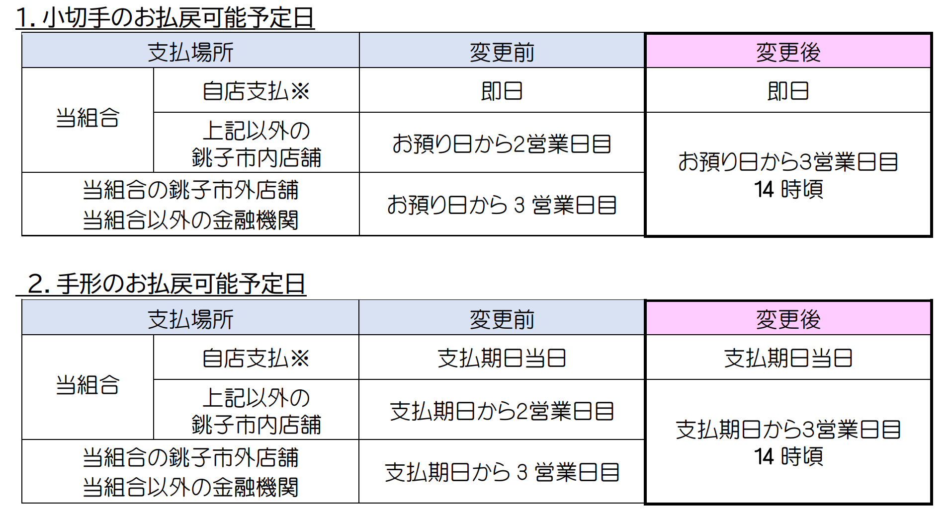 電子交換所設立により、全国共通のひとつの交換所での取り扱いとなるため、お払戻可能予定日が統一され、下記のとおり変更となります。