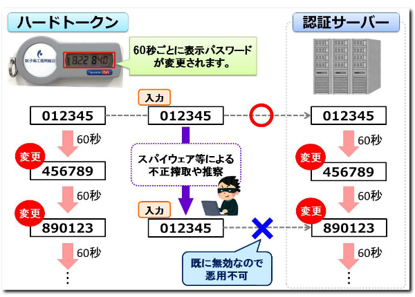- パスワードは約60秒ごとに変化し、第3者が取得しても60秒後にはそのパスワードは無効となるため、セキュリティの強化が図れます。