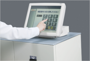 貸金庫カードと暗証番号入力により貸金庫室に入室していただきます。